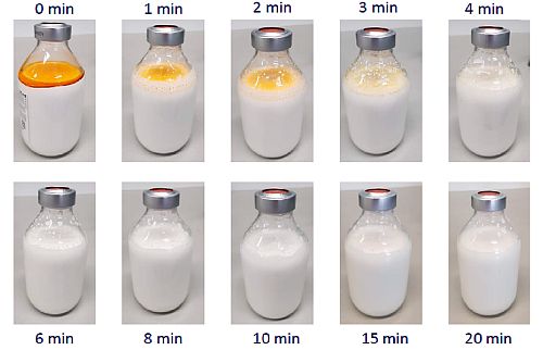The evolution of droplet size and propofol distribution was monitored in situ and non-destructively, maintaining sterility, using Spatially Resolved Dynamic Light Scattering and Near Infrared Spectroscopy, respectively. Using response surface methodology, an optimum was found for a 4 % w/v propofol formulation with a ~15 min mixing time in a flask shaker at a 40◦ shaking angle.